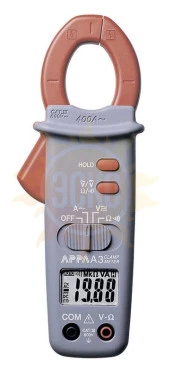 Клещи электроизмерительные APPA A3: Переменный ток 0,1 … 400А (50/60Гц); Базовая погрешность ± 1,9 %; Постоянное напряжение 0,1 ... 600В; Переменное напряжение 0,1 ... 600В (50Гц-500Гц); Сопротивление 0,1 Ом ... 20 МОм (автовыбор); Прозвон цепи (до 200 Ом); Удержание параметров; Дисплей 3 1/2 разяда (2000); Максимальный диаметр провода 32 мм; Автовыключение питания; Противоударное исполнение (1,3м).