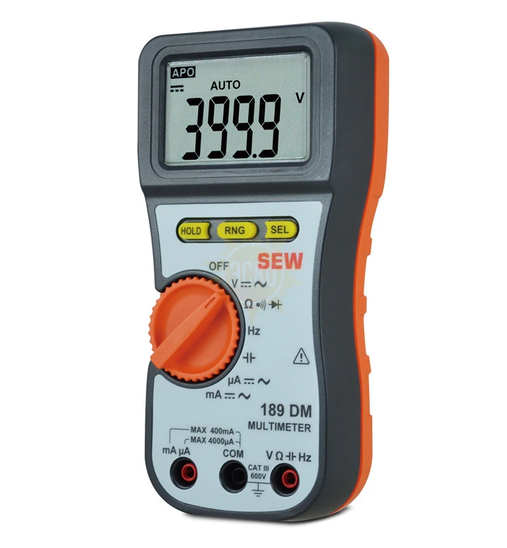 Мультиметр цифровой 189 DM осуществляет измерения напряжения постоянного/переменного до 1000 В/ 750 В в диапазоне до 100 кГц, тока постоянного/переменного до 400 мА, частоты до 100 кГц, ёмкости в диапазоне от 4 нФ до 4 мФ и производит прозвон цепи и проверку диодов.