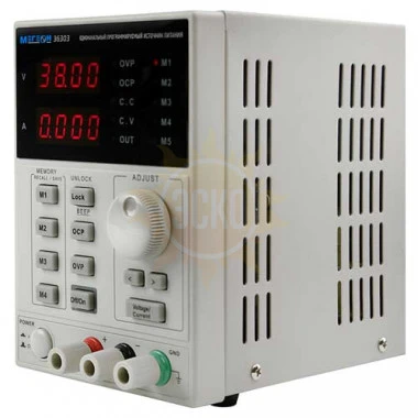 МЕГЕОН 36303 – это компактный, высокоточный, одноканальный программируемый источник питания. Выходное напряжение 0…30 В с током нагрузки 0…3 А. В источнике реализовано: программирование до 5 значений напряжения и тока (любое из пяти значений выбирается в одно нажатие), термокомпенсация, компенсация по току, подавление пульсаций и высокоэффективная программируемая защита от перегрузки по току и напряжению (OVP, OCP), и короткого замыкания на выходе.
