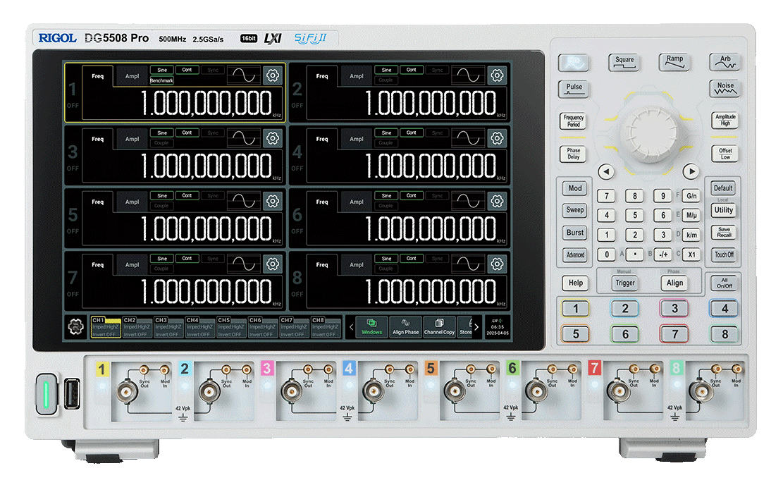 Генератор сигналов произвольной формы DG5508 Pro — это представитель нового поколения генераторов сигналов RIGOL с изолированными каналами. Изделие собрано на технологической платформе Si-Fi II, обеспечивает максимальную частоту дискретизации 2,5 Гвыб/с, выходную частоту синусоидального сигнала 500 МГц, вертикальное разрешение 16 бит, имеет ряд новых функциональных возможностей для удовлетворения потребностей в различных отраслях и сценариях применения.