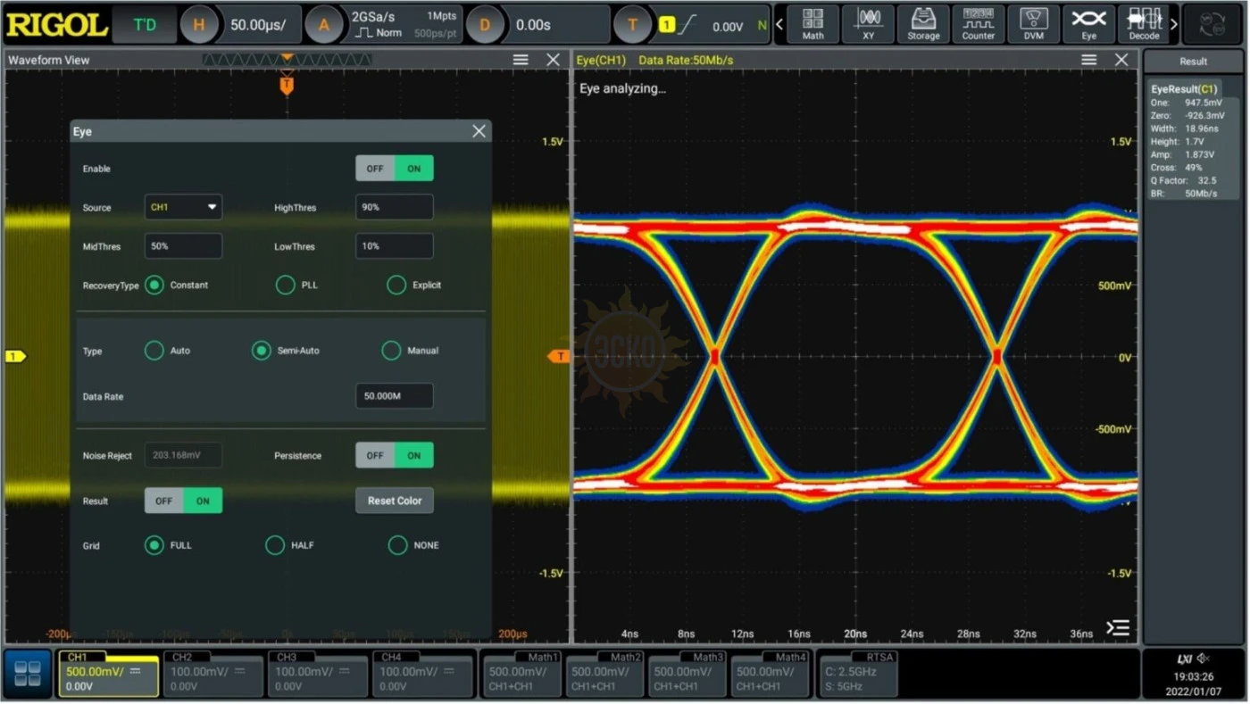 Программная опция DS80000-JITTA активирует в осциллографах RIGOL серии DS80000 возможности анализа глазковых диаграмм и измерения параметров джиттера (фазового дрожания фронтов сигналов опорной частоты и передаваемых данных). Проведение измерения и анализа доступно во всех аналоговых каналах.