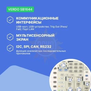 Пользователь может подобрать для себя необходимую конфигурацию запоминающего осцилллографа VERDO SB1644, добавить в осциллограф VGA выход, функции встроенного генератора сигналов, и мультиметра-регистратора, получив функционал до 6 приборов в одном корпусе. Прибор имеет сенсорный экран и встроенную функцию анализатора последовательных протоколов (I2C, SPI, CAN, RS232).
