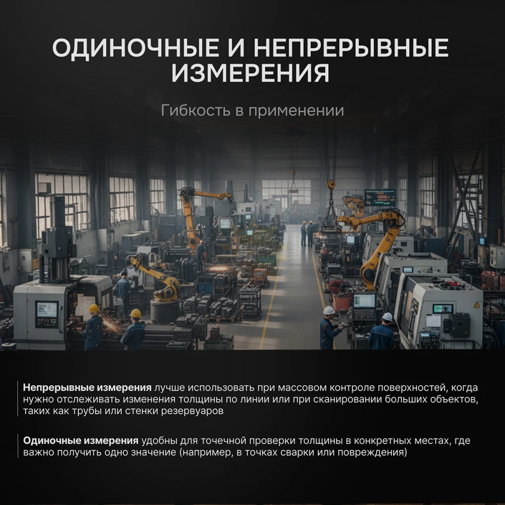 Портативный толщиномер ультразвуковой RGK UTM-10 реализует измерения в одиночном и непрерывном режиме, с отображением на дисплее текущего показателя, наибольшего, наименьшего и среднего значения, и типа материала. Режим измерений с сигналом тревоги позволяет контролировать однородность толщины целевого объекта, выявляя "на слух" места локальных истончений, превышающие допустимые значения, устанавливаемые через настройки.