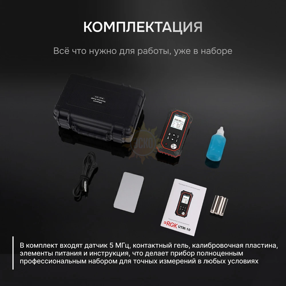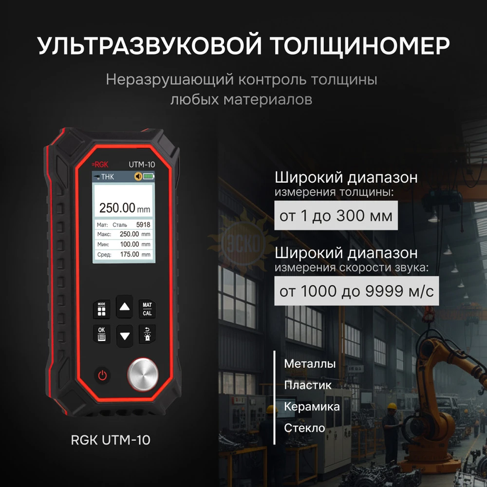 - Ультразвуковая технология дает возможность выполнять измерение изделий, изготовленных из любых металлов, пластмасс, стекла, керамики и других твердых материалов, при одностороннем доступе к ним, за счет чего обеспечивается универсальность толщиномера RGK UTM-10.
