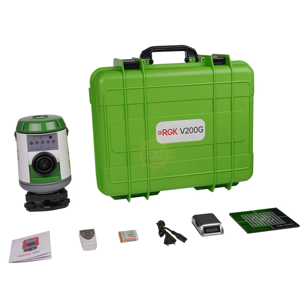 Строительный прибор вертикального проектирования RGK V200G выполнен в прочном цилиндрическом корпусе, размещенном на трегере, с помощью которого производится установка изделия на штатив над заданной точкой и первичное горизонтирование. Зенитный лазерный излучатель коаксиален и унифокален со зрительной системой телескопа, и соосен с надирным лазером, выполняющим роль отвеса.