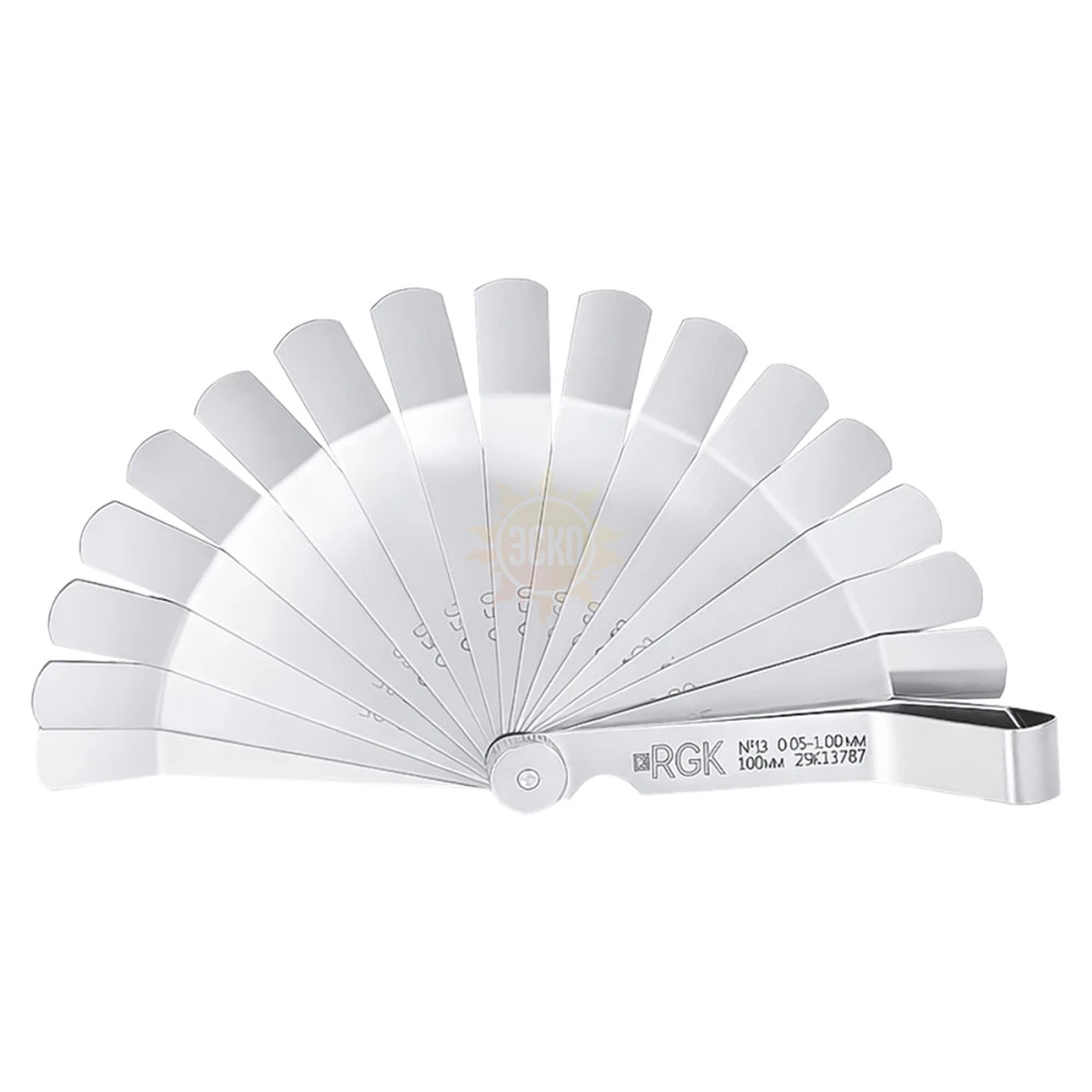 Набор щупов №13 (0,05-1,00) относится к механическим измерительным инструментам, которые предназначены для определения линейных размеров и могут использоваться в качестве рабочих калибров для контроля зазоров в машиностроении и других отраслях с целью обеспечения проектных посадок деталей и узлов в процессе сборки/монтажа и при выполнении регулировок. Ручной инструмент включает в себя помещенные в рамочную обойму на общей оси, обеспечивающей шарнирное соединение, 20 стальных измерительных пластин нормированного размера, толщина которых возрастает от 0,05 до 1,00 мм с шагом 0,05 мм. Данный комплект оптимизирован для выполнения замеров в труднодоступных местах, что обеспечивается благодаря изогнутой форме щупов.