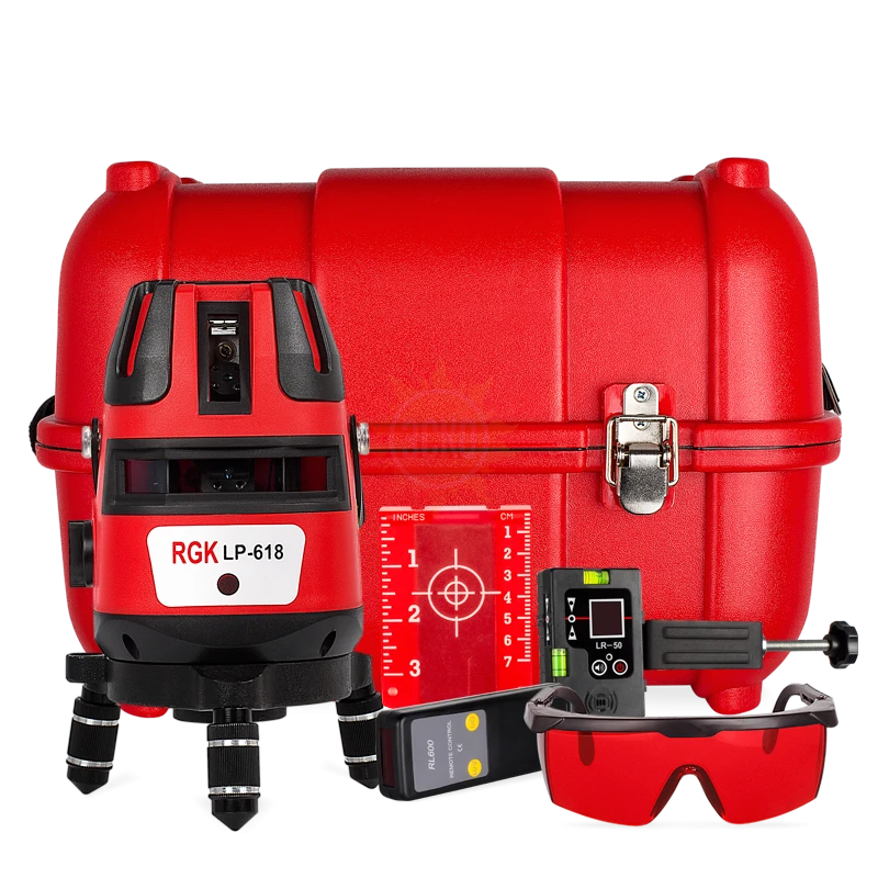 Лазерный нивелир RGK LP-618 очень прост в управлении, для работы с ним не нужно специальных навыков. Кнопки переключения режимов работы интуитивно понятны. В данной модели в комплекте предусмотрен детектор лазерного излучения LVH 100, что не требует дополнительных трат для увеличения функциональности прибора. Поворотный корпус RGK LP-618 исключает ошибки, вызванные переносом прибора, а также позволяет плавно сдвинуть излучаемый луч на необходимый угол. В комплекте также идет функциональный пульт, с помощью которого можно переключать режимы на расстоянии. Лазерный построитель RGK LP-618 на трегере имеет круглый пузырьковый уровень, что позволяет контролировать точность установки прибора. Благодаря подъемными винтами можно быстрее и точнее приводить прибор в горизонтальное положение. На основании корпуса есть лазерный отвес, позволяющий устанавливать прибор над требуемой целью. Корпус соответствует стандартам качества, а прорезиненные вставки защищают прибор от грязи, пыли а также уменьшают негативное воздействие при транспортировке.