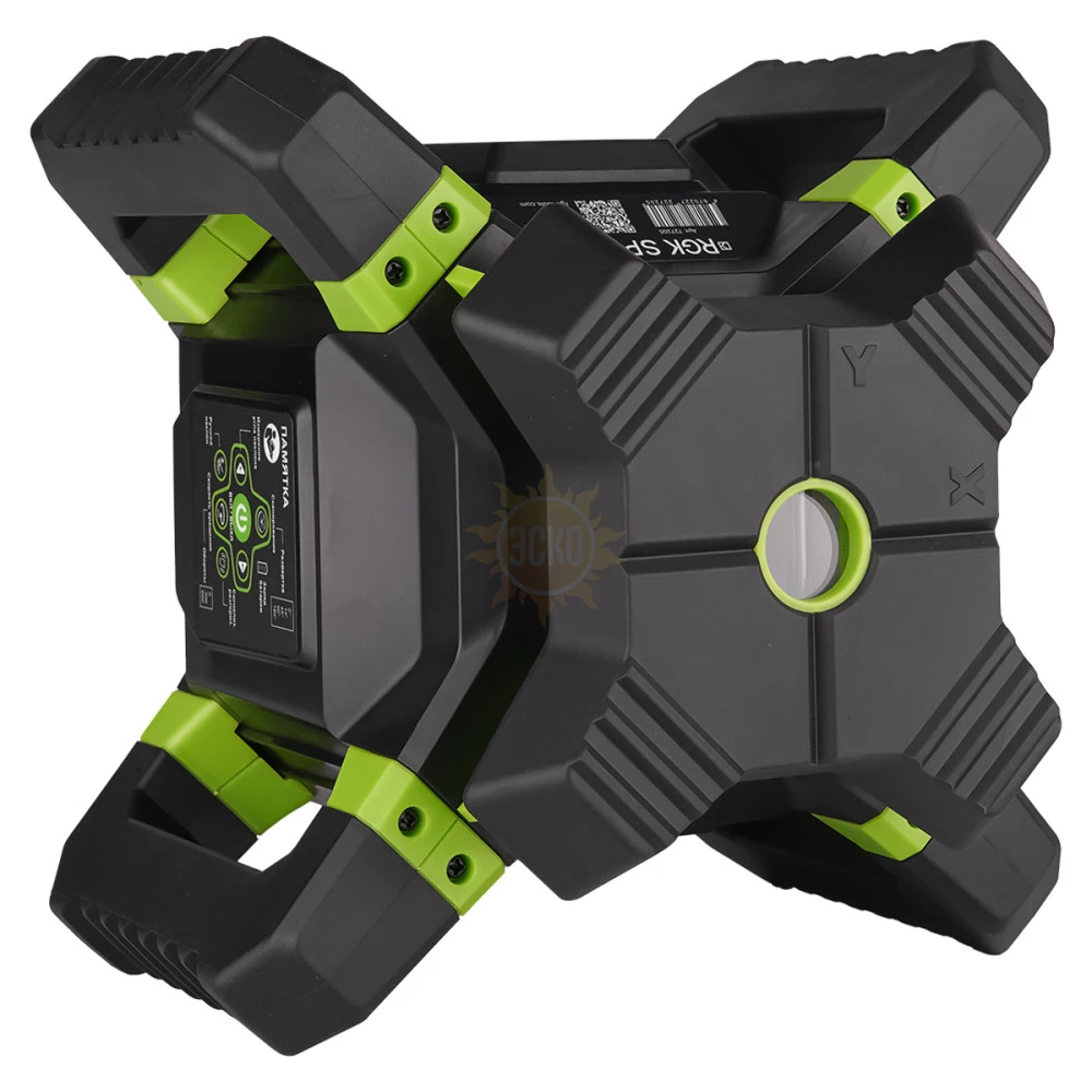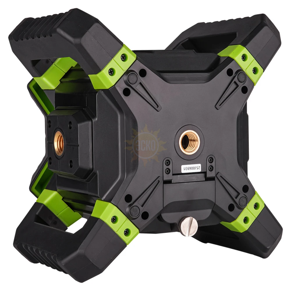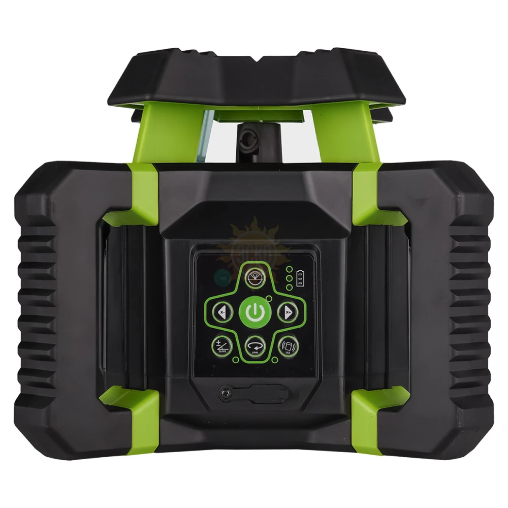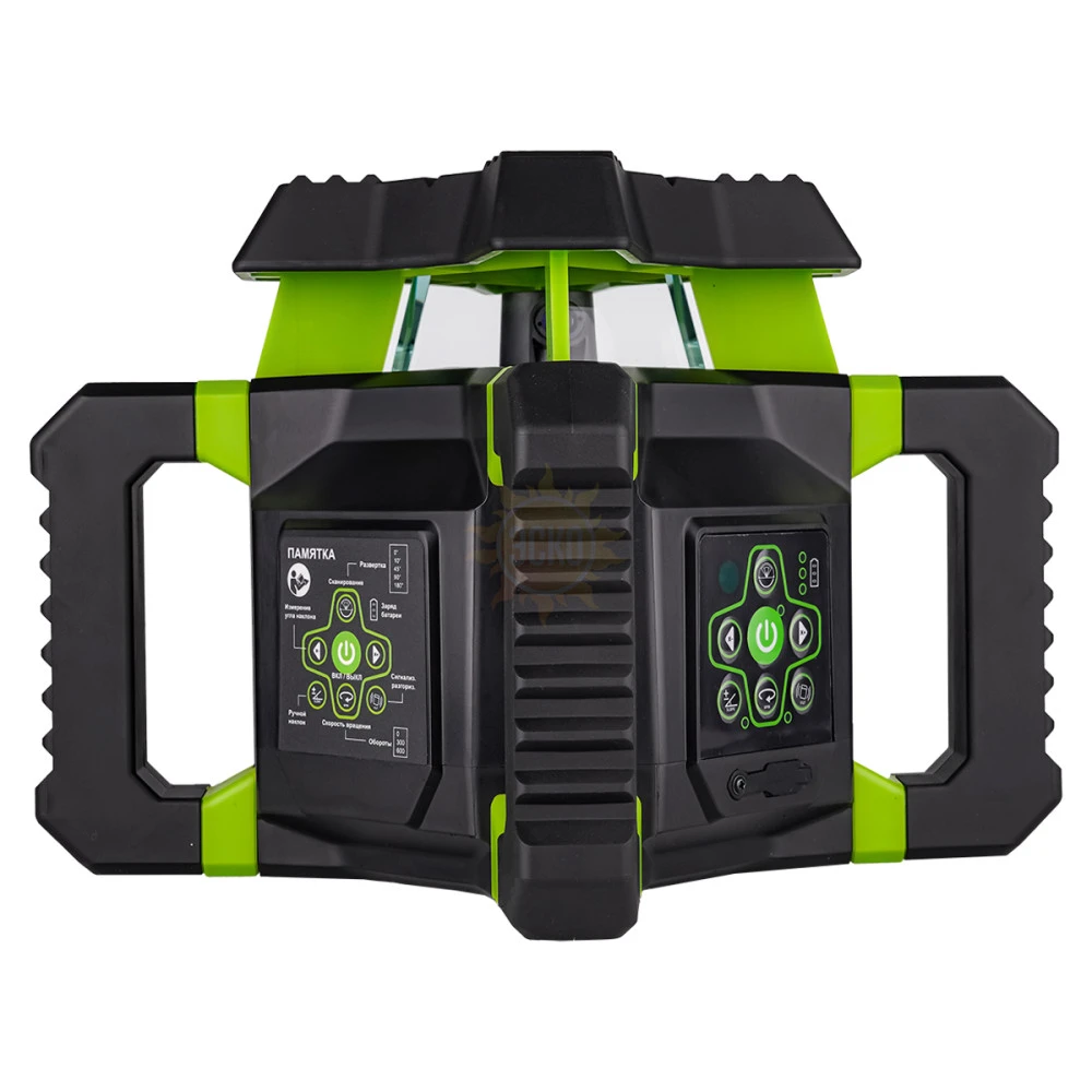 - 4 боковые ручки, благодаря параллельному расположению, позволяют устанавливать ротационный нивелир на любых горизонтальных поверхностях для проецирования отвесной плоскости при боковом выравнивании, исключая необходимость обязательного задействования штатива.