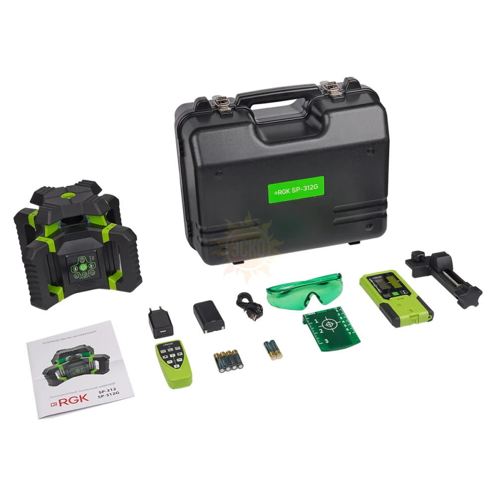 Ротационный нивелир RGK SP-312G представляет собой профессиональный проецирующий прибор строительного назначения, оборудованный аккумуляторным питанием, который характеризуется высокой прочностью и простотой использования. В отличие от базового варианта, G-модификация оборудуется лазерным излучателем зеленого цвета, луч от которого лучше визуально различим для человеческого глаза, по сравнению с красным лазером. Включенный в комплект поставки приемник излучения обеспечивает возможность выполнения работ на площадках до 600 м.