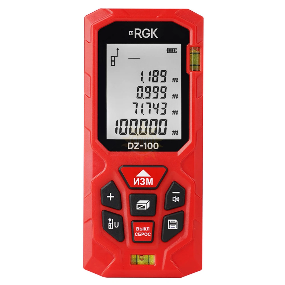 Результаты измерений лазерный дальномер RGK DZ100 может отображать в разной размерности, в 6 вариантах выбираемых через настройки единиц измерений, включая метрическую и англо-американскую систему исчисления. Поддерживается возможность изменения начальной точки отсчета для замеров от углов и поверхностей. Акустический сигнализатор оповещает о нажатии кнопок управления, исключая непреднамеренные действия с инструментом.