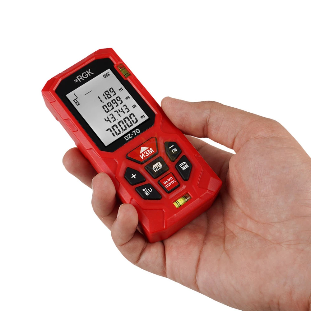 Лазерный дальномер RGK DZ70 представляет собой компактный измерительный инструмент с батарейным питанием, позволяющий определять расстояния до удаленных объектов на дистанциях до 70 м с точностью ±2 мм бесконтактным методом. Прибор снабжен крупноразмерным 4-строчным дисплеем, обеспечивающим высокую наглядность, и встроенными поперечным и продольным пузырьковыми уровнями на передней панели – для измерения высот и горизонтальной дальности.