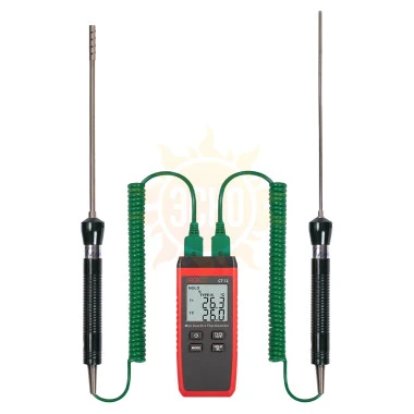 Контактный термометр RGK CT-12 с зондом температуры воздуха RGK TR-10A и погружным зондом температуры RGK TR-10W - это надежный и точный прибор для измерения температуры в диапазоне от -40°С до +400°С с комплектной термопарой. Главное преимущество этой модели - 2 гнезда для подключения выносных датчиков с функцией определения разности между каналами.