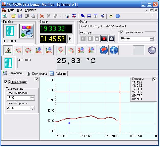 Первая вкладка – Самописец – позволяет наблюдать график изменений измеряемой величины во времени. Здесь же доступны курсорные измерения и «тревожная сигнализация», которая позволяет автоматически отслеживать выход измеряемого параметра за указанные границы. Кроме цветовой и звуковой сигнализации, программа посылает системные сообщения с кодом «аварийной ситуации», что позволяет подключать произвольные внешние приложения для нужной реакции на событие.