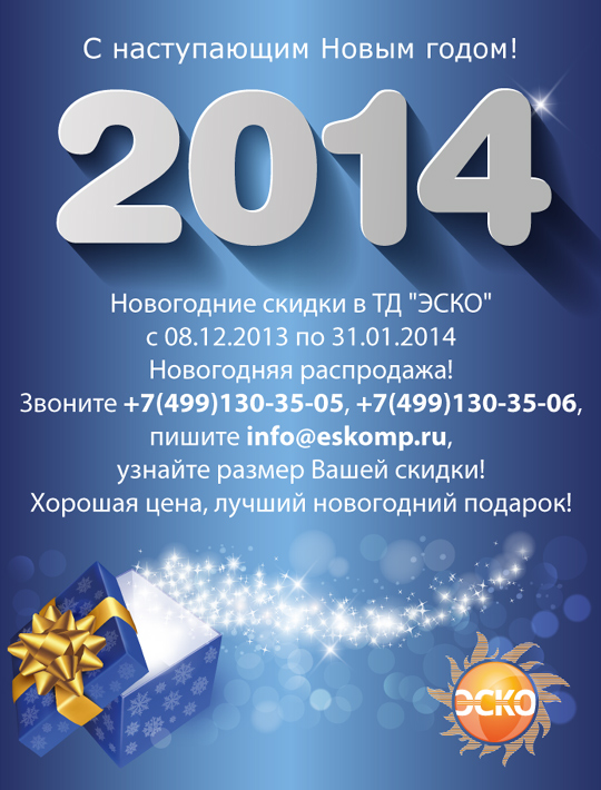 Новогодние скидки в ТД "ЭСКО" с 08.12.2013 по 31.01.2014 Новогодняя распродажа! Звоните +7(499)130-35-05, +7(499)130-35-06, пишите info@eskomp.ru, узнавайте размер Вашей сегодняшней скидки! Хорошая цена, лучший новогодний подарок!